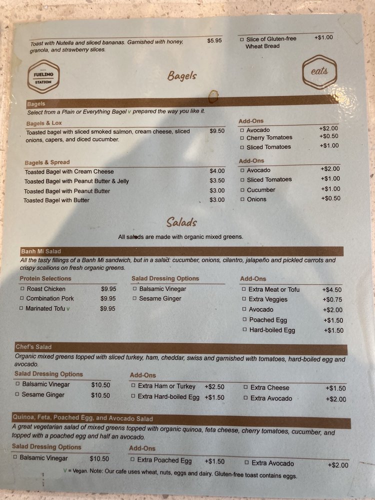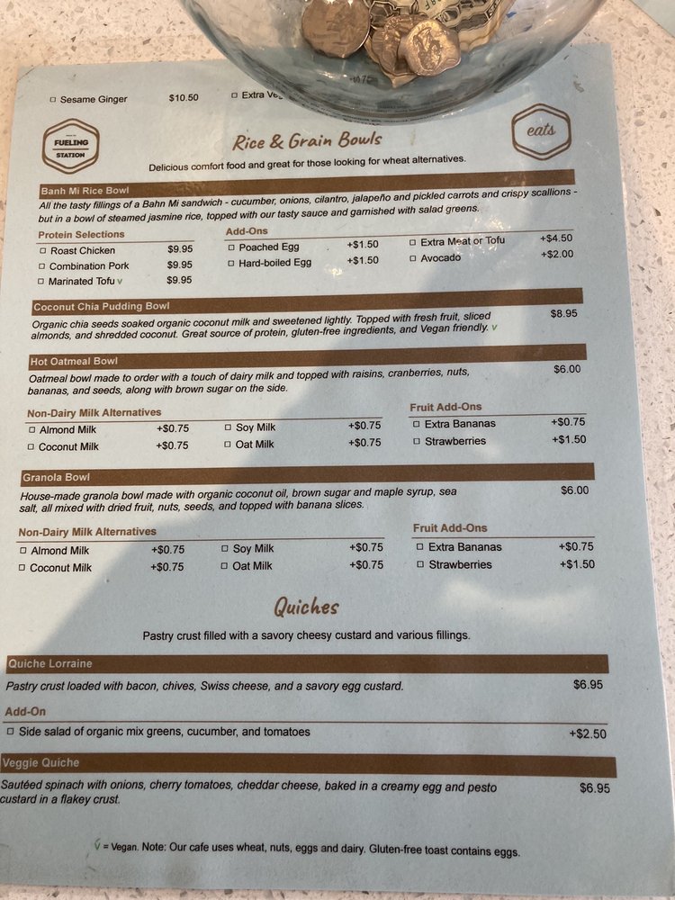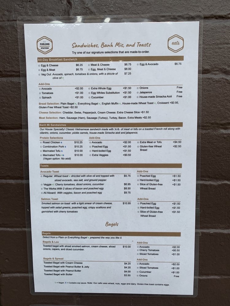Introducing the menu at Fueling Station, located at 2436 Polk St, San Francisco, this trendy cafe combines a lively atmosphere with an alluring selection of dishes perfect for all meals. With a focus on fresh ingredients, their offerings range from delightful avocado toasts to innovative twists like the quiche Lorraine and a unique banh mi sandwich that fuses Vietnamese and French flavors seamlessly.